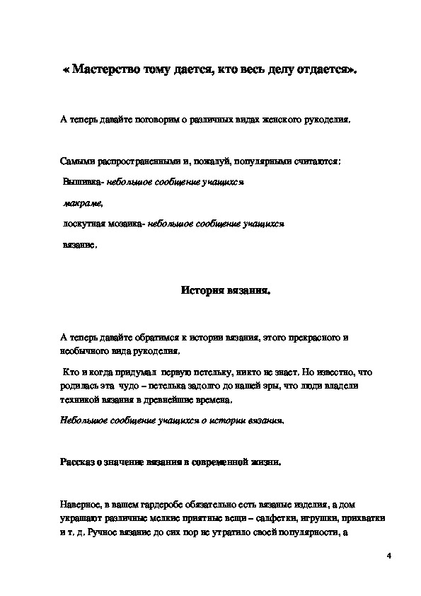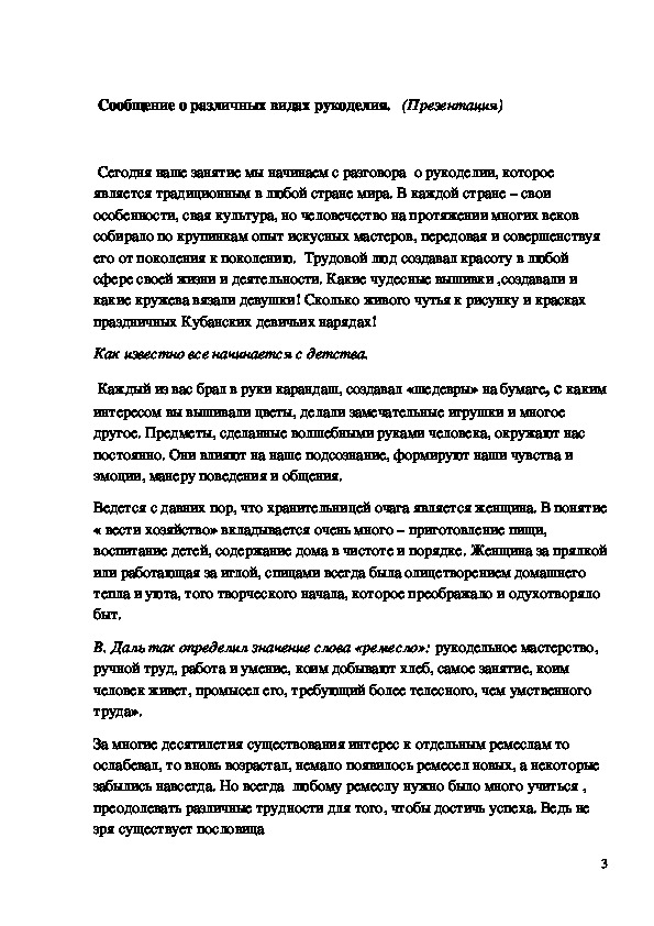 Сегодня наше занятие мы начинаем с разговора о рукоделии, которое