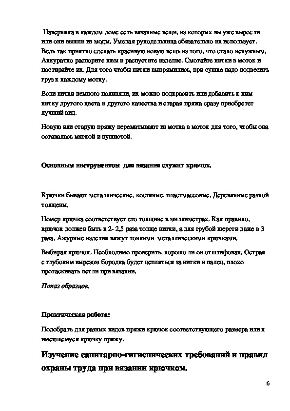 - познакомить учащихся с инструментами и материалами, используемыми при вязании, правилами подготовки пряжи к вязанию;