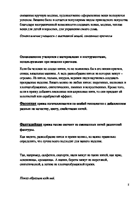 Оборудование: образцы готовых изделий, связанных крючком, набор