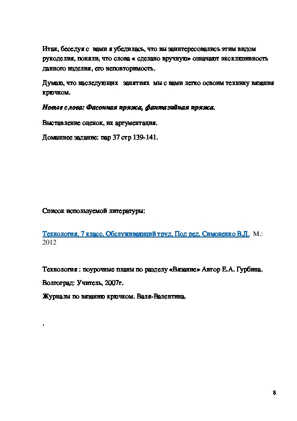 Технология : поурочные планы по разделу «Вязание» Автор Е.А. Гурбина.