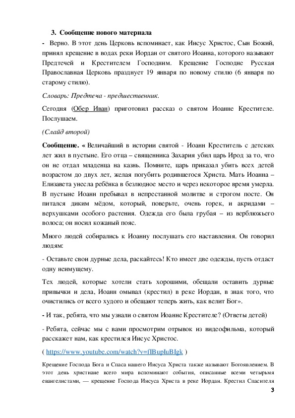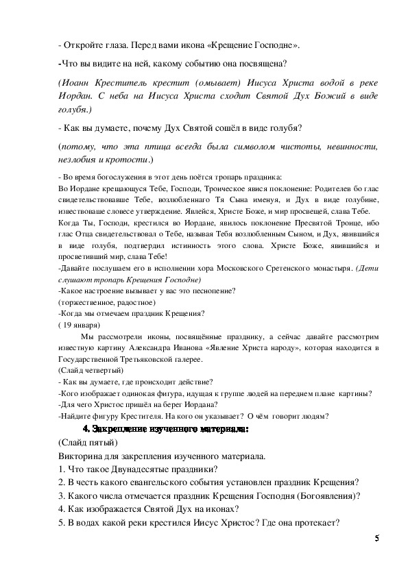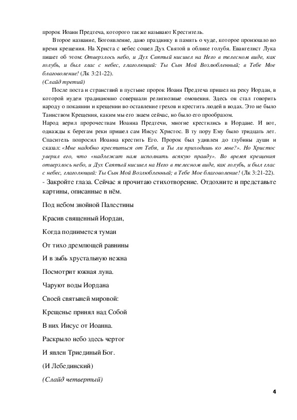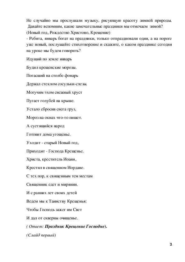 Оборудование: ноутбук, проектор, презентация для сопровождения урока, видеофильм «Крещение Иисуса Христа. Богоявления», музыка Антонио Вивальди “Времена года” (зима), тропарь «Крещение Господне».Конспект урока "Крещение Господне" 4 класс