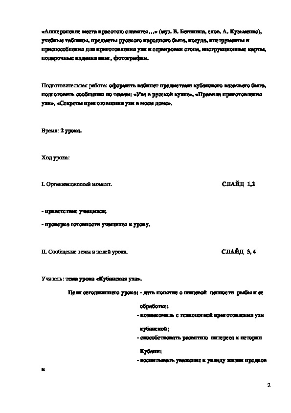 Оборудование: интерактивная доска, презентация «Кубанская уха», запись песни