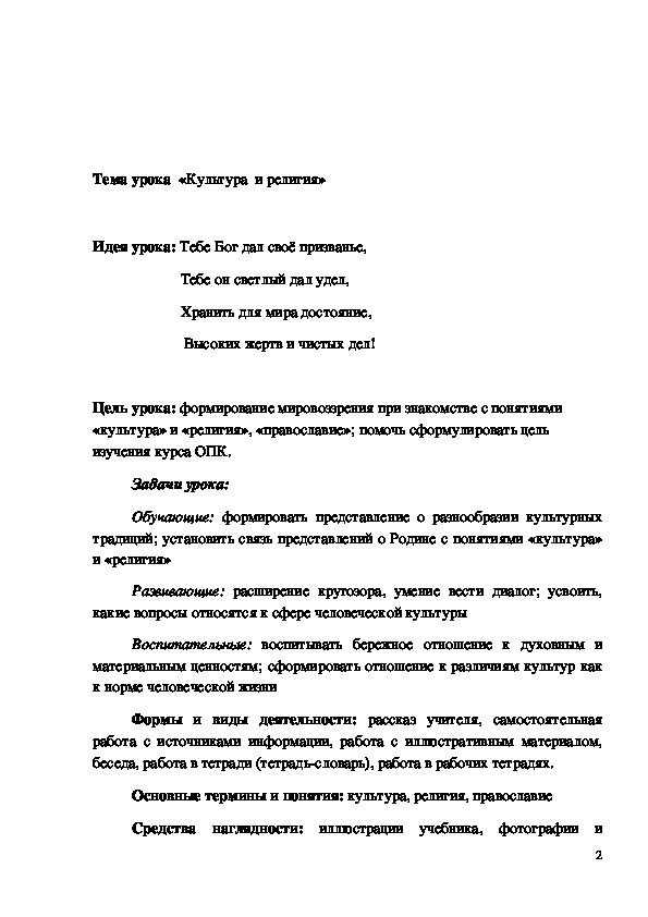 Цель урока: формирование мировоззрения при знакомстве с понятиями «культура» и «религия», «православие»; помочь сформулировать цель изучения курса ОПК.