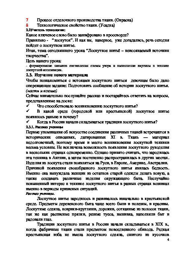 – расширение представлений учащихся об истории возникновения и развития лоскутного шитья;