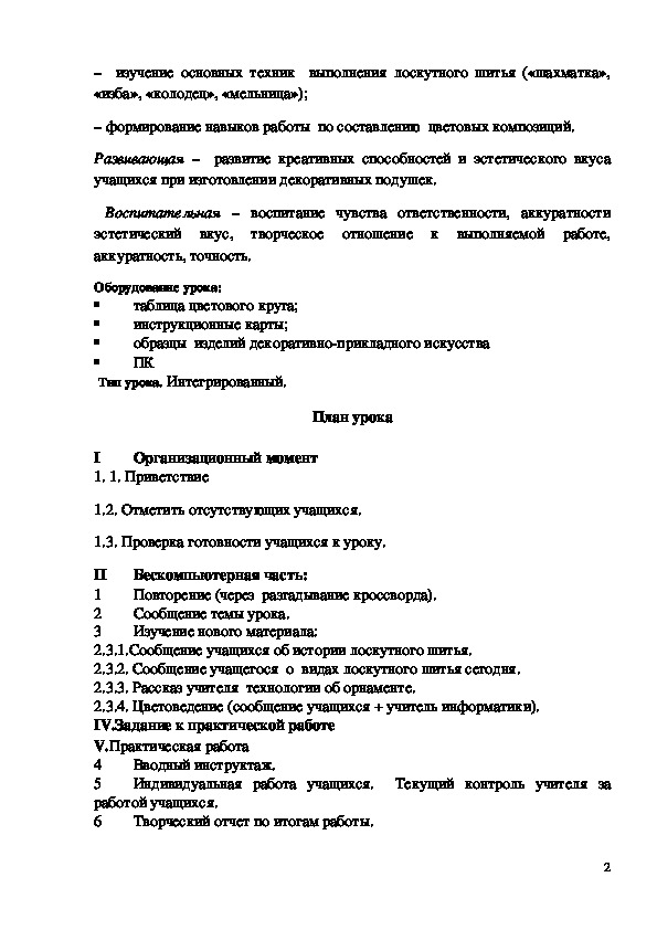 - формирование навыков составления схемы узора для оформления декоративной подушки и изготовление шаблонов при помощи ПК.