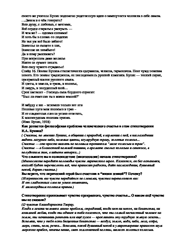 Счастье, по мнению Бунина, — это полное слияние с природой, это мирный труд на родной