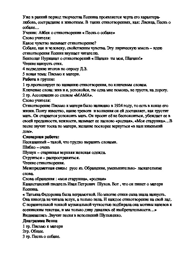 Цели: Продолжить изучение жизни и творчества поэта, знакомство с новым стихотворением С. Есенина « Письмо к матери». Развивать активное, творческое ассоциативное мышление, устную речь умение анализировать, сравнивать, делать умозаключения. Воспитание любви к родине, природе, к чтению произведений поэта, помочь учащимся открыть для себя глубину чувств лирических героев.Конспект урока "Лирика С. Есенина. Письмо к матери" 11 класс