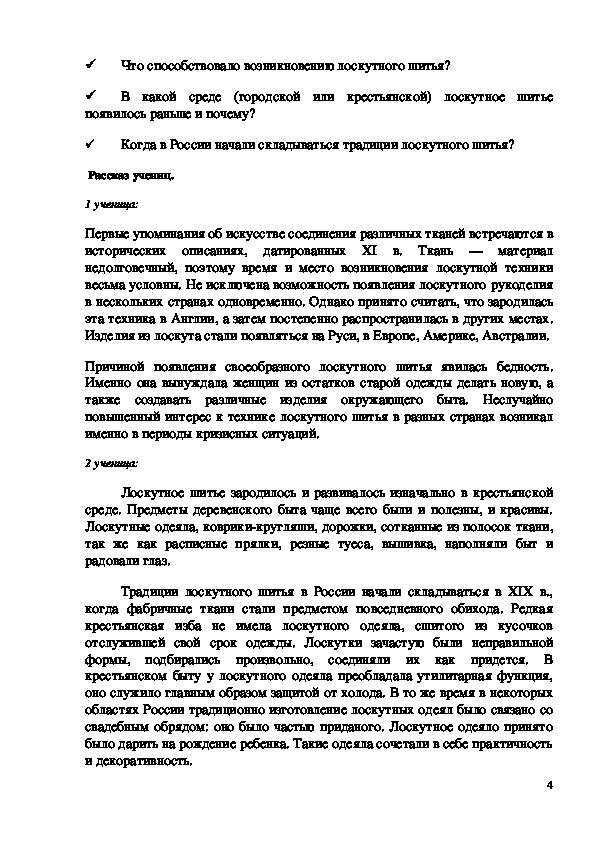 Образовательные: – расширение представлений учащихся об истории возникновения и развития лоскутного шитья;