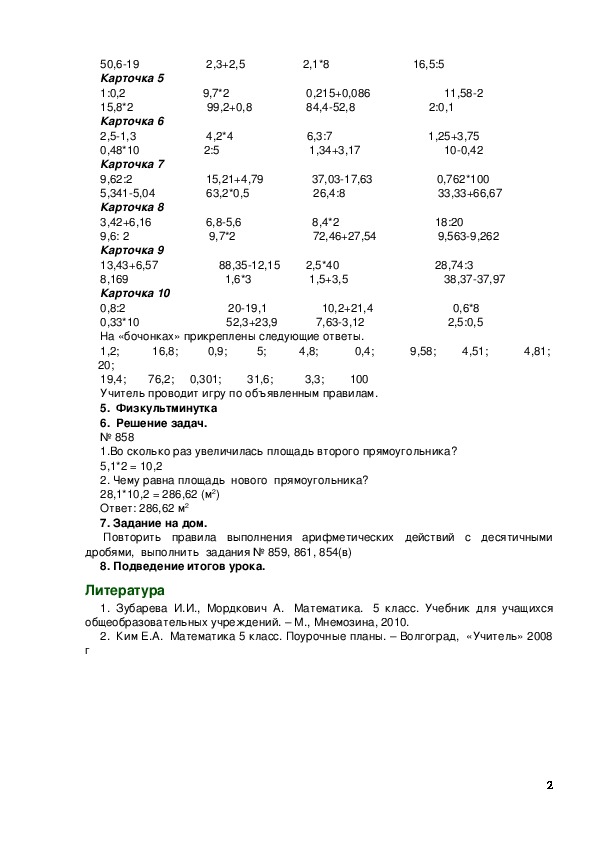 2. Ким Е.А. Математика 5 класс. Поурочные планы. – Волгоград, «Учитель» 2008