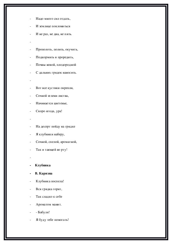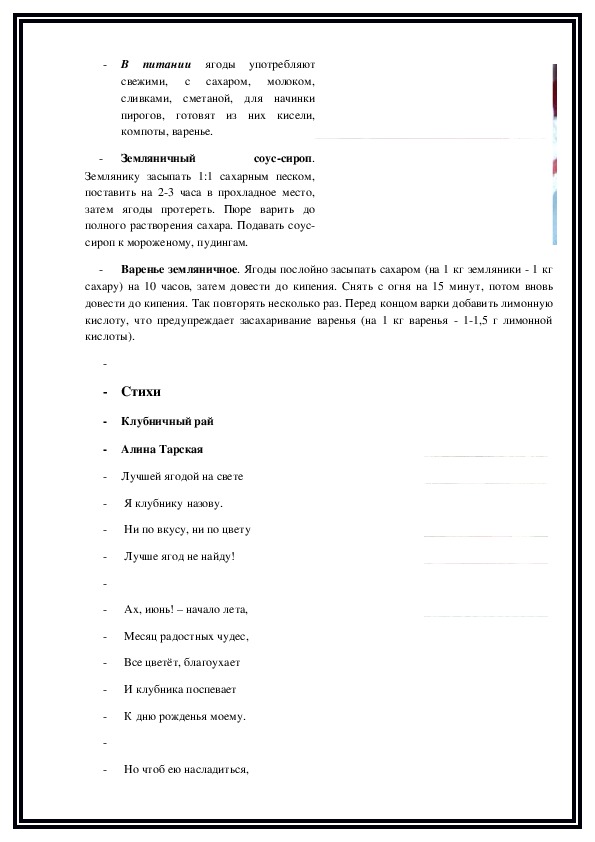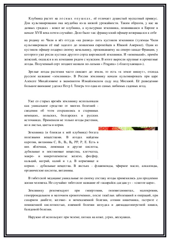 на родину из Чили и вёз оттуда «на развод» пять кустиков земляники (туземцы Чили культивировали её ещё задолго до появления европейцев в Южной Америке). Один из кустиков офицер подарил своему начальнику, проживавшему на северо-западе Франции, у которого уже росли кустики другого сорта виргинской земляники. И «новенький», причём женский, оказался в их компании рядом с мужским. В итоге выросли крупные и ароматные ягоды. Полученный сорт позднее назвали по-латыни « Fragana» («благоухающая»).конспект
