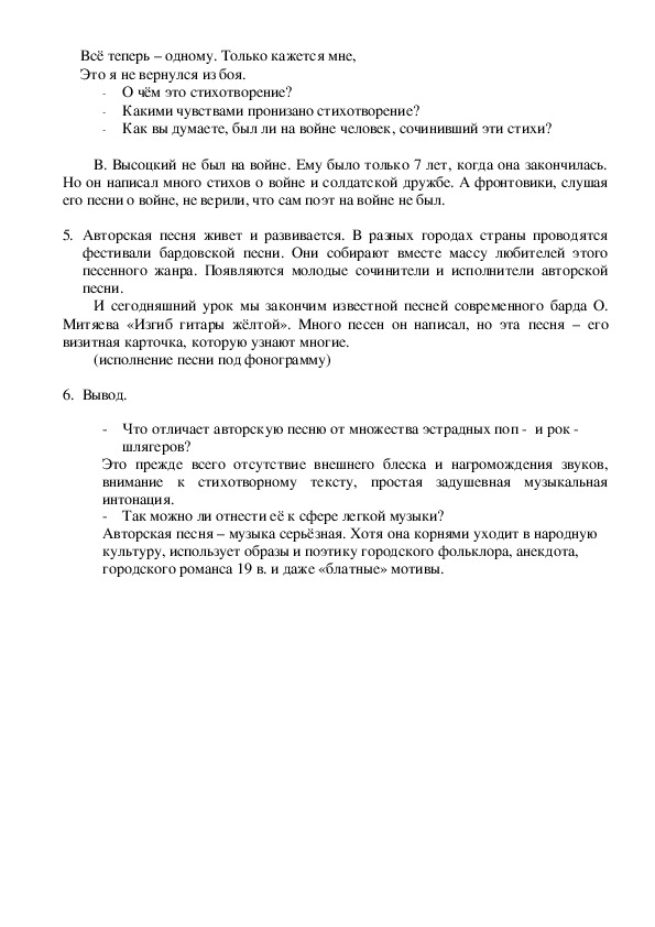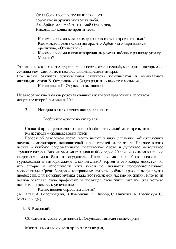 Урок в 7 классе посвящён проблеме авторской песни. Воникает вопрос: авторская песня - это серьёзный или лёгкий жанр музыки? Ученики знакомятся с поэтическим творчеством Б.Окуджавы и В Высоцкого.Урок в 7 классе посвящён проблеме авторской песни. Воникает вопрос: авторская песня - это серьёзный или лёгкий жанр музыки? Ученики знакомятся с поэтическим творчеством Б.Окуджавы и В Высоцкого.