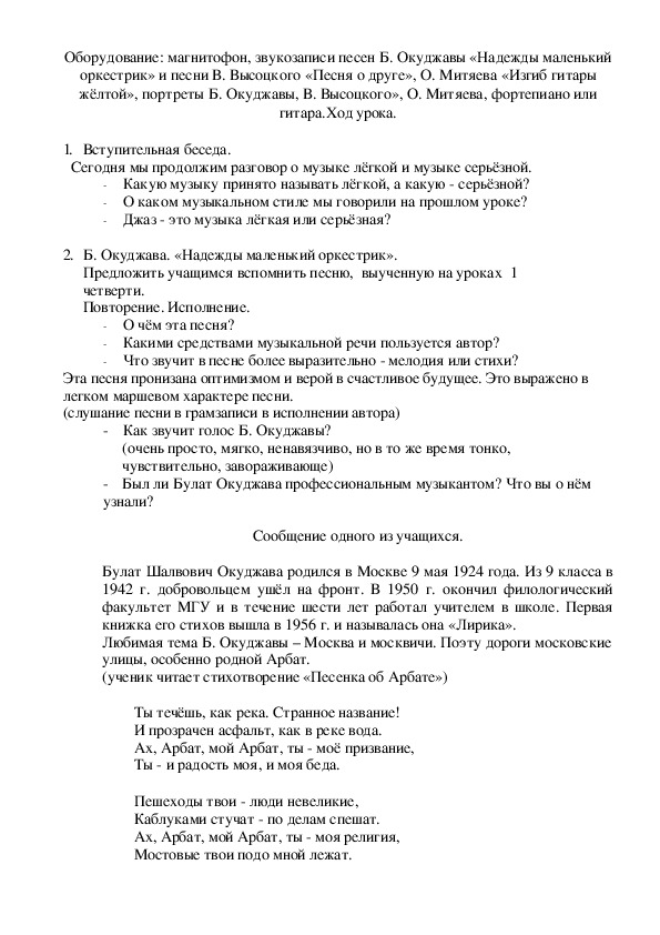 1Оборудование: магнитофон, звукозаписи песен Б. Окуджавы «Надежды маленький