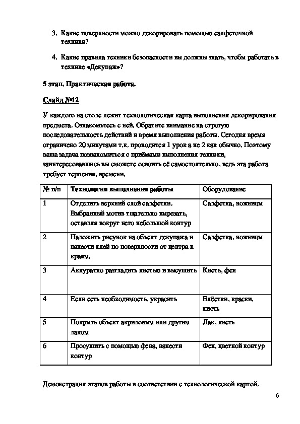 Демонстрация этапов работы в соответствии с технологической картой.