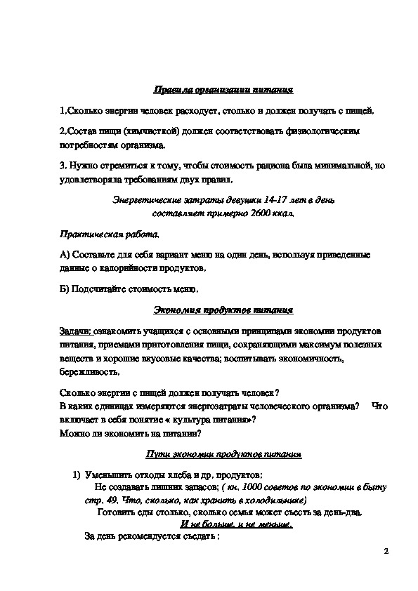 Цели: познакомить учащихся с основными законами организации питания; раскрыть значение рационального, сбалансированного питания для здоровья человека; научить составлять меню на один день с учетом показателя затрат на энергопотребление.