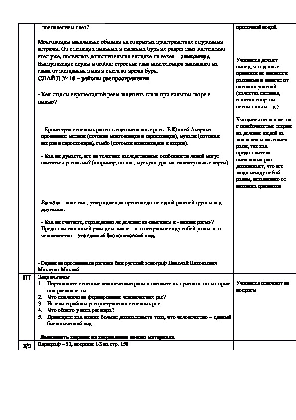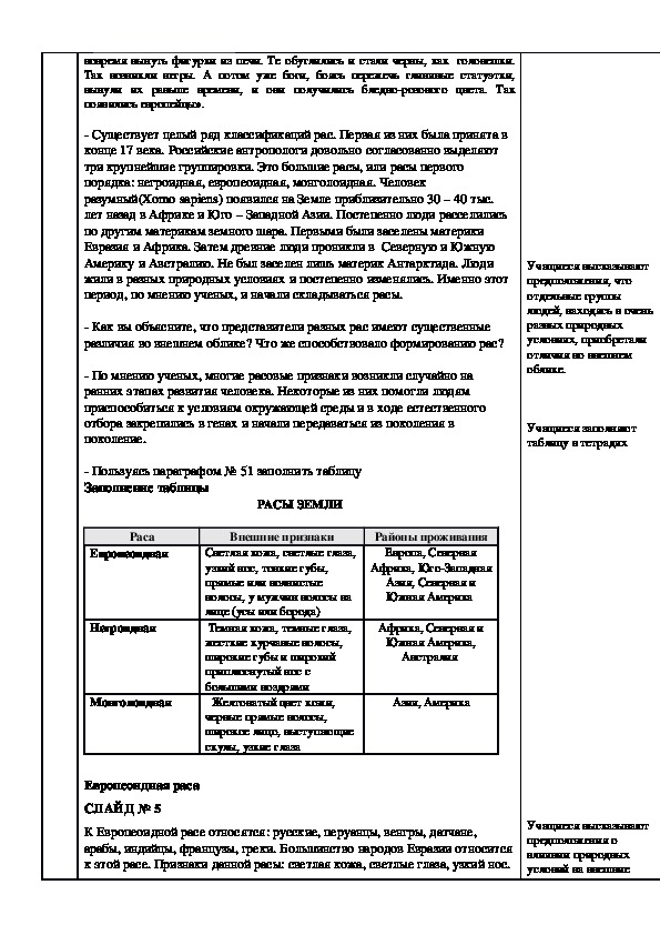 1) делать выводы о едином происхождении человеческих рас на основании знаний, полученных на уроке;