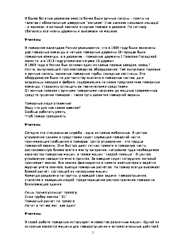 Ведь в деревнях и городах было много деревянных построек. Наиболее страшные пожары возникали в сельской местности. Остановить огонь было невозможно, за несколько часов поселение выгорало полностью, нередко в таких пожарах гибли люди. На месте деревни оставались головёшки да печные трубы. В городах действовали городские пожарные команды. 200 лет назад пожары обнаруживали с каланчи – высокой башни. У пожарной части было два этажа. На втором этаже жили пожарные с семьями. На первом стояли повозки с бочками с водой, баграми, лестницами. Но самое главное здесь – лошади – самые лучшие, самые резвые. Пожарная часть, выезжающая в те времена на пожар, представляла собой солидную процессию. Впереди на лихом коне – трубач, громкими звуками предупреждающий прохожих о том, что пожарные с большой скоростью едут на пожар. Отсюда и пошло выражение: “Летит как на пожар”. Но дом зачастую не успевали спасти. На смену лошадям пришли мощные машины, а труба явилась родоначальницей сирен, которые устанавливаются на пожарных автомобилях. Сейчас автомобили находятся в огромном специальном гараже.урок
