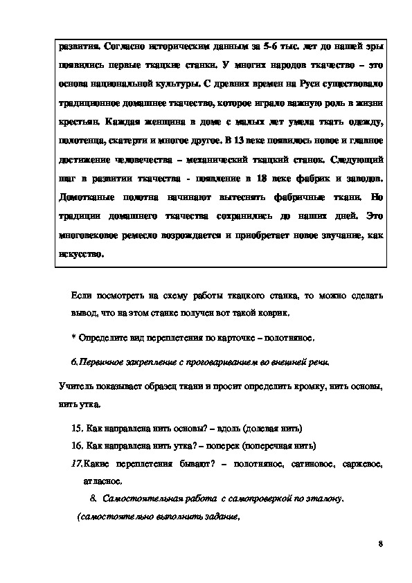 Учитель показывает образец ткани и просит определить кромку, нить основы,