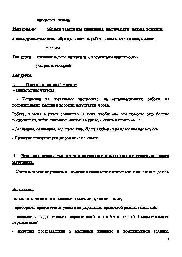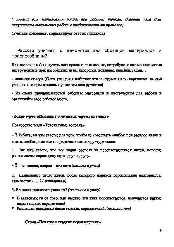 материалами, инструментами и приспособлениями для вышивания; дать представление о машинной вышивке и использовании компьютерной техники, расширить знания о структуре ткани; развивать представление о видах ткацких переплетений.