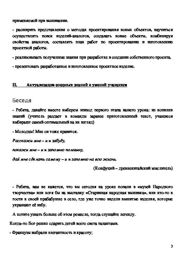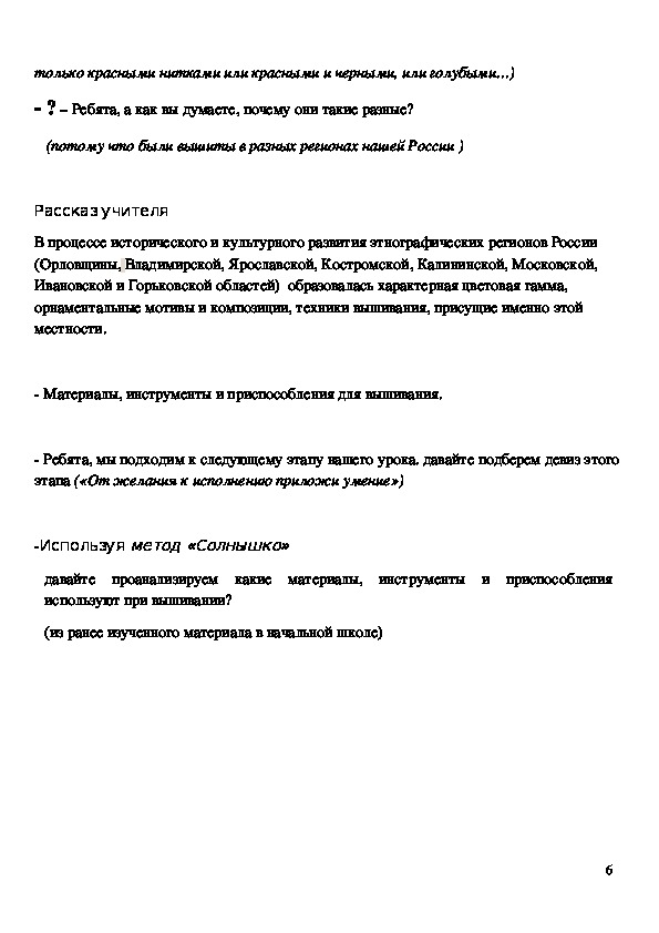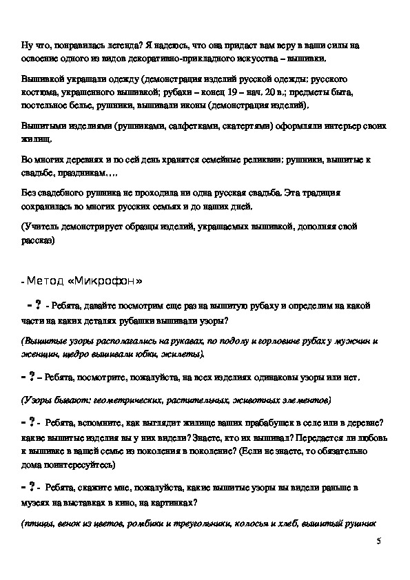 Учитель знакомит учащихся с задачами технологии изготовления вышитых изделий.