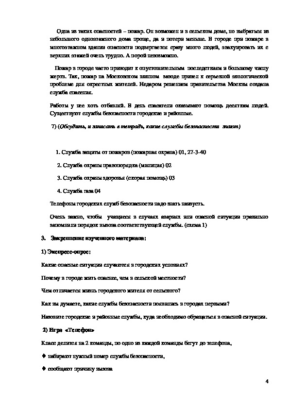 • службы, входящие в систему обеспечения безопасности города, номера телефонов и содержание информации при их вызове;