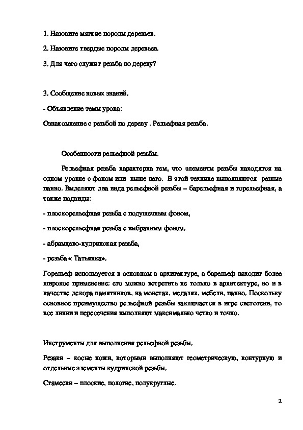1. Образовательные: Ознакомить учащихся с рельефной резьбой и ее подвидами.