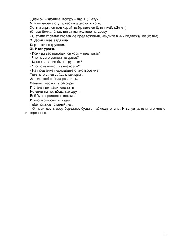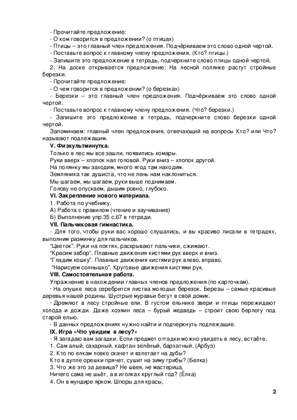Оборудование: рисунки с изображением леса, гриба, муравейника, медведя, березок, схема подлежащего, аудиозапись пения птиц, карточки.