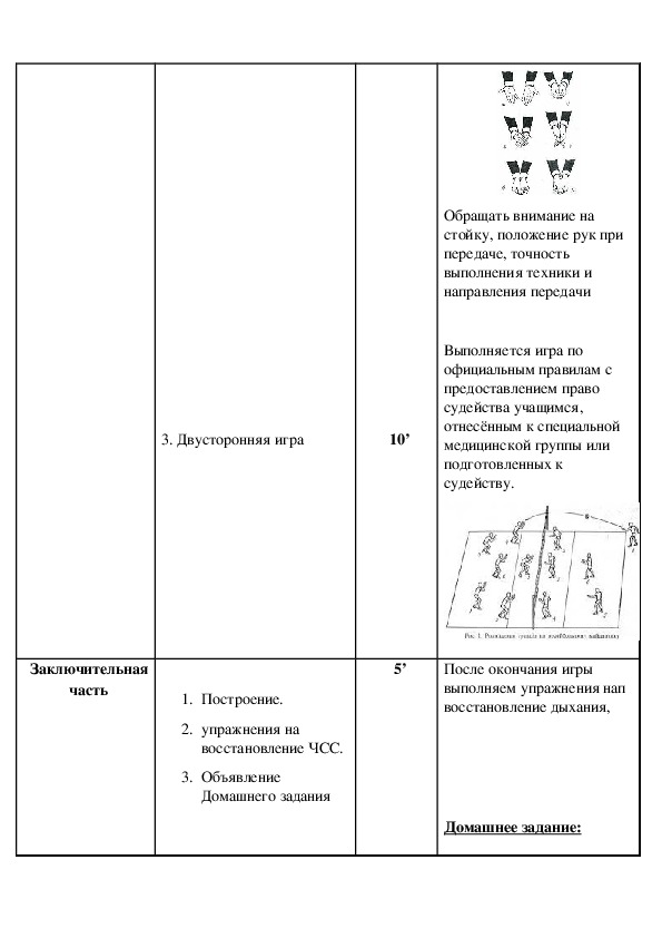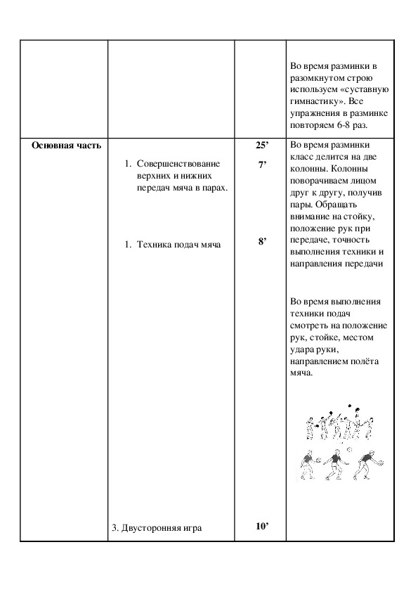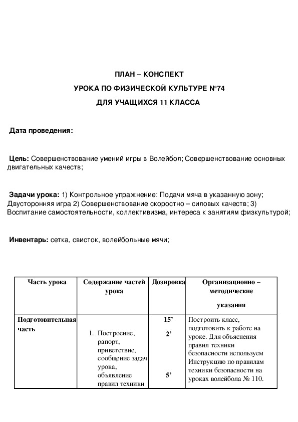 Задачи урока: 1) Совершенствование техники высоких и низких передач мяча; 2) Совершенствование скоростно – силовых качеств; 3) Воспитание самостоятельности, коллективизма, интереса к занятиям физкультурой;