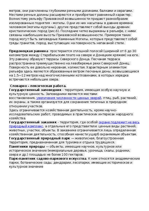 Разнообразие ландшафтных территорий Донецкого края позволяет учителю составить по отдельно взятым территориям, конспект урока. Но мы организуем так работу на уроке, чтобы глухой ученик самостоятельно проработал предложенный материал. Главный приём на уроке - это составление краткого конспекта, заполнение таблицы "Природный комплекс возвышенности". Домашнее задание - составить визитную карточку Приазовской возвышенности.
