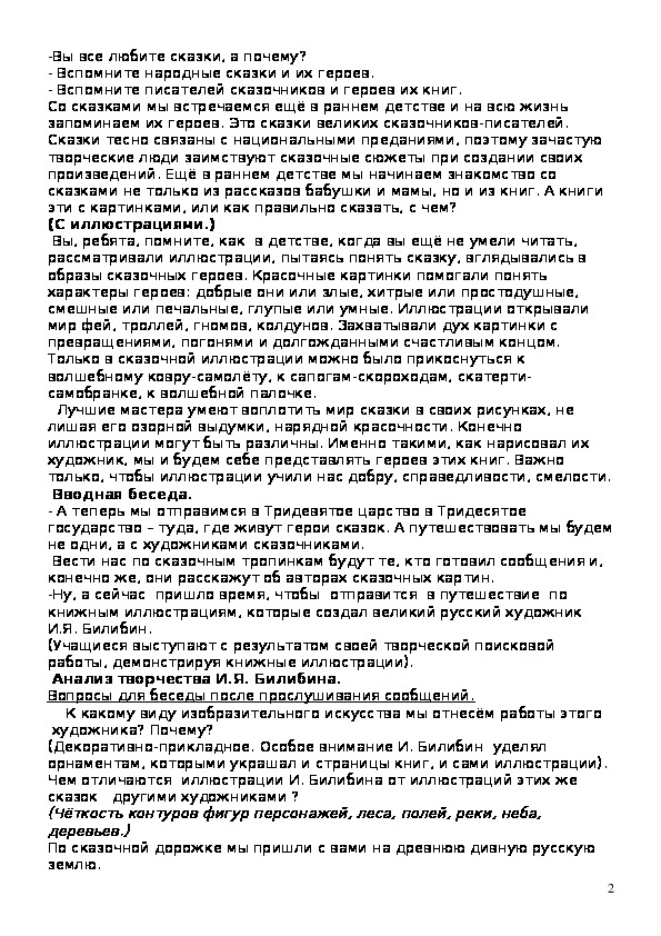 - обучение умению простейшими средствами на примере творчества В.Васнецова и И.Я. Билибинасоздавать своих сказочных героев;
