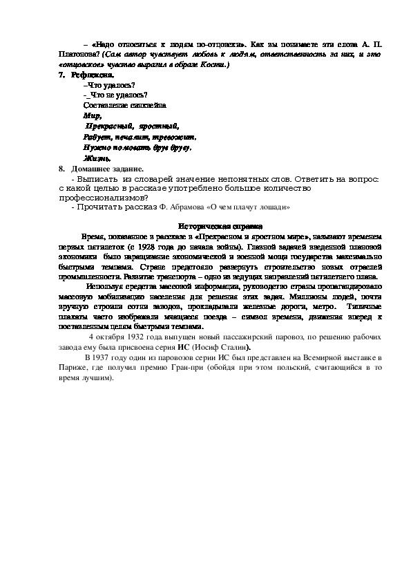 – А теперь о последней фразе рассказа. Платонов называет наш мир «прекрасным и
