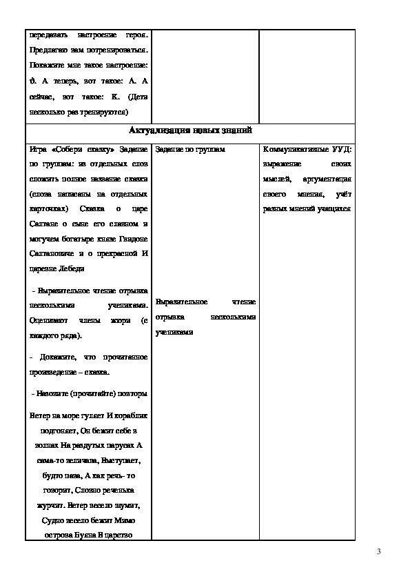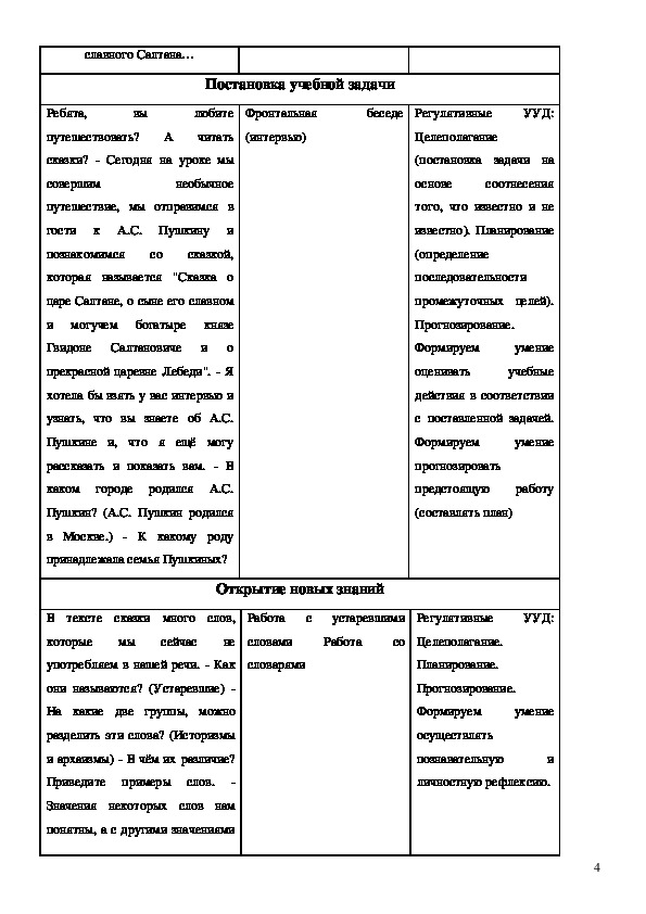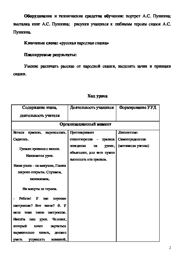 планировать своё действие в соответствии с поставленной задачей.Оборудование и технические средства обучения: портрет А.С. Пушкина;