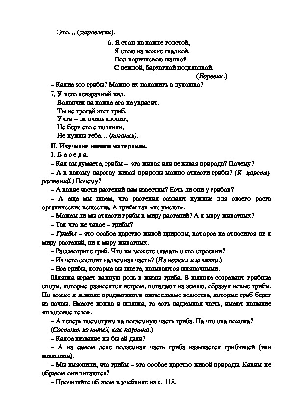 Цели: познакомить с особенностями строения и способом питания шляпочных грибов; формировать представление о роли грибов в жизни леса.