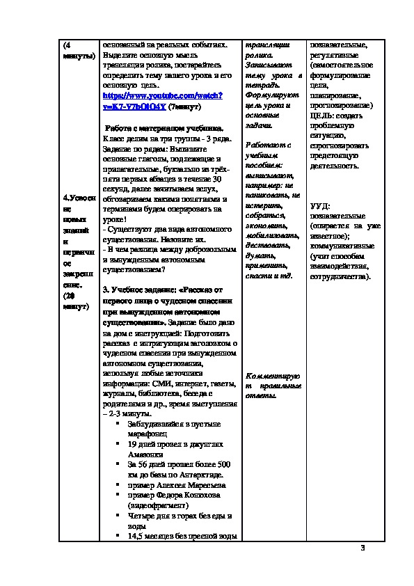 Цель урока: познакомить учащихся с понятием добровольной и вынужденной автономии человека в природной среде, сформировать у учащихся представления о возможностях выживания в условиях дикой природы.