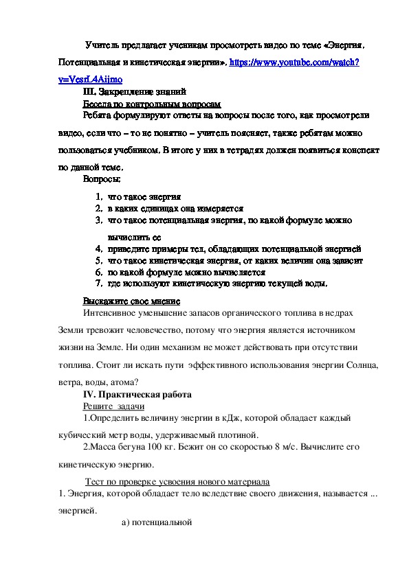 II. Изучение нового материалаУчитель предлагает ученикам просмотреть видео по теме «Энергия.