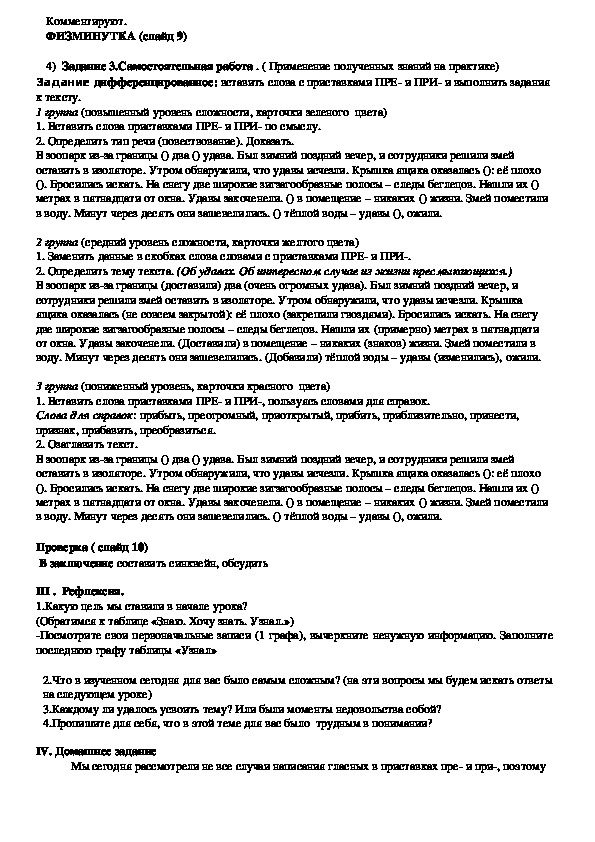 Задание дифференцированное: вставить слова с приставками ПРЕ и ПРИ и выполнить задания