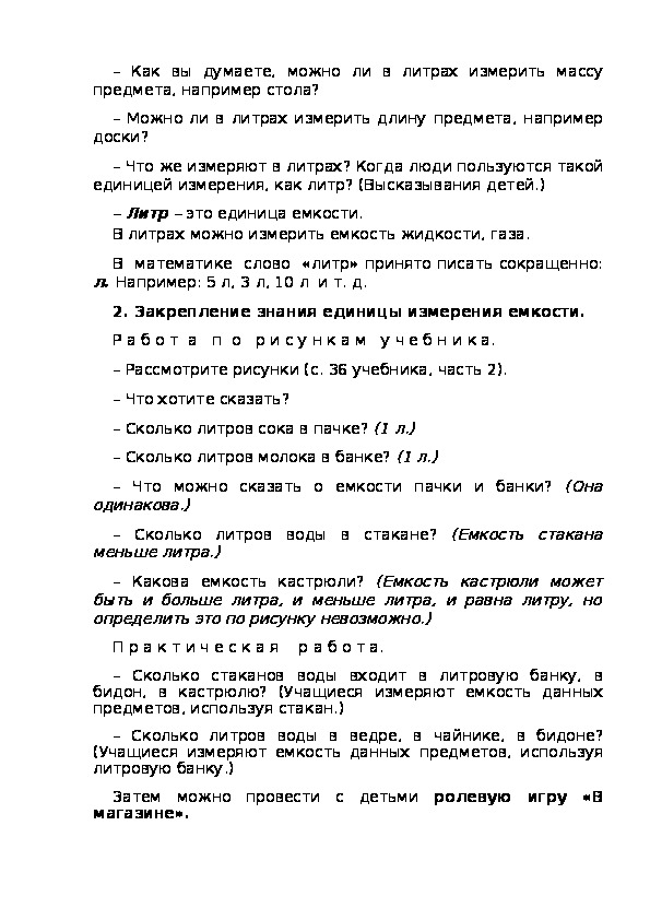 познакомимся еще с одной единицей измерения – литром.– Как вы думаете, можно ли в литрах измерить массу