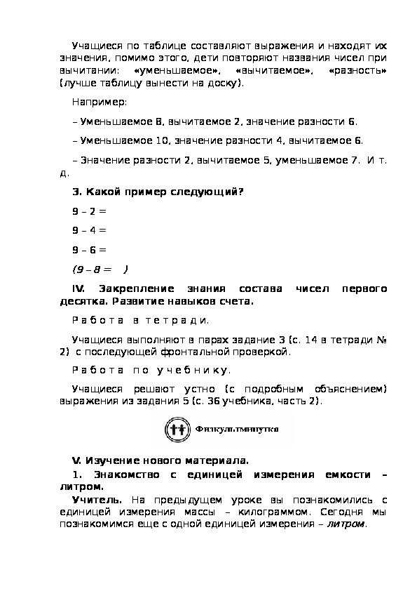 Цели урока: познакомить учащихся с единицей измерения емкости – литром; закреплять знание состава чисел первого десятка; развивать навыки счета; продолжать работу над задачами изученных видов.
