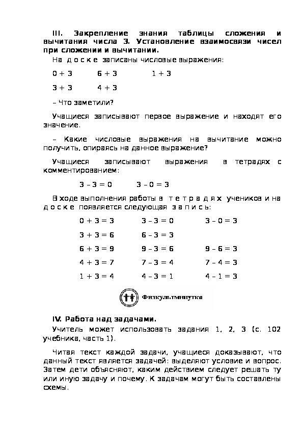 Цели урока: закреплять у учащихся знание таблицы сложения и вычитания числа 3; закреплять знание состава изученных чисел; развивать навыки счёта; продолжать работу над задачами; развивать мышление учащихся.