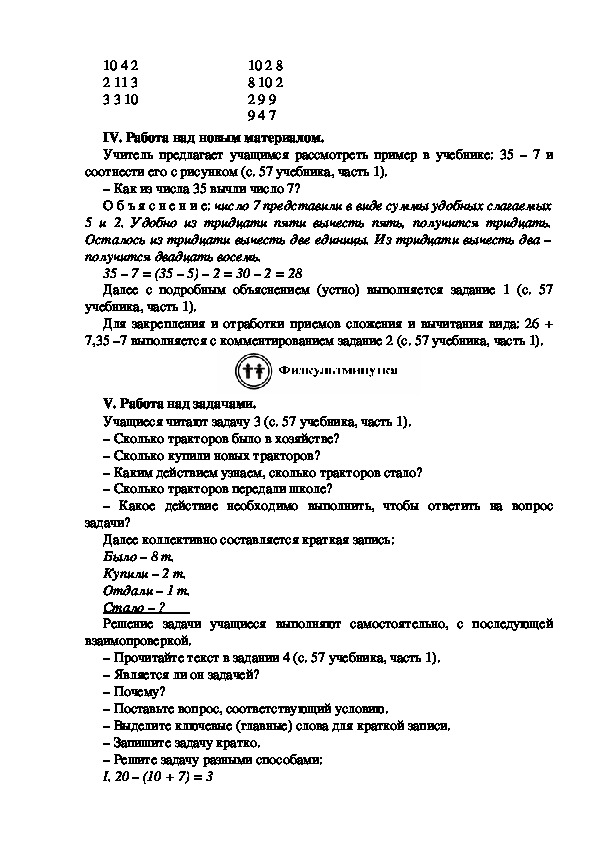 Цели: познакомить учащихся с новым приемом вычитания; формировать умение учащихся находить значения сумм в случаях вида: 26 + 7; продолжать работу над задачами и выражениями; развивать наблюдательность, мышление учеников, навыки счёта.