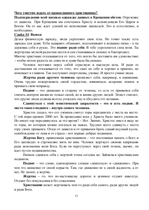 Цель урока: познакомить с православным пониманием подвига, его бескорыстной и жертвенной стороной.