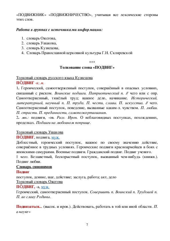 Обучающая: узнать этимологию слова «подвиг», понять смысл и взаимосвязь слов подвиг, жертва, подвижник.