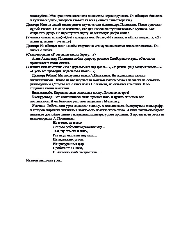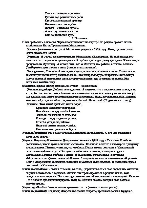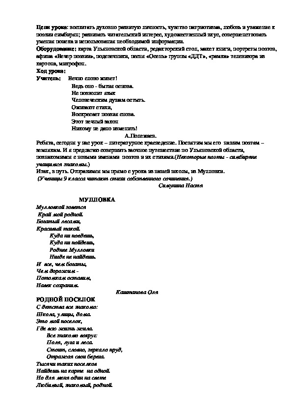 Цели урока: воспитать духовно развитую личность, чувство патриотизма, любовь и уважение к поэзии симбирян; развивать читательский интерес, художественный вкус, совершенствовать умения поиска и использования необходимой информации.Конспект урока "Поэзия наших старших современников (литературное краеведение)" 9 класс