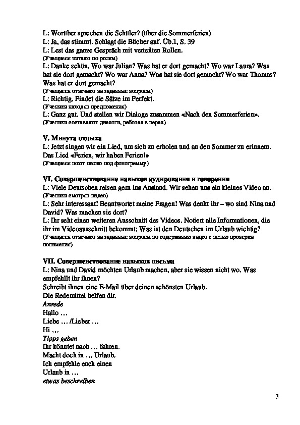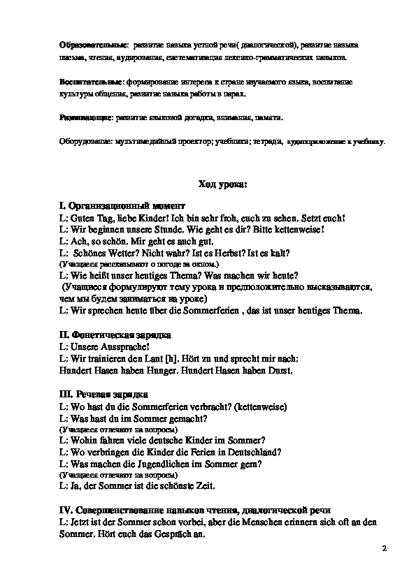 Конспект урока "После летних каникул" 8 класс.Конспект урока по немецкому языку