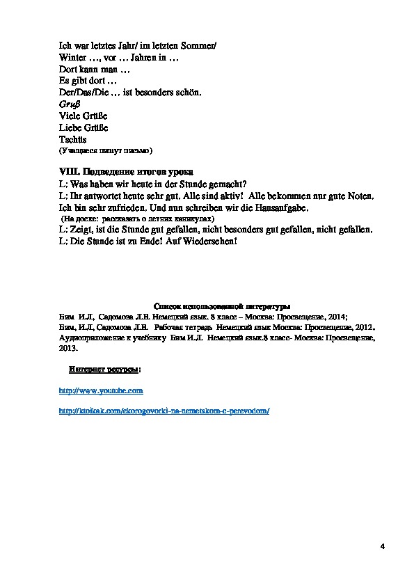 Бим И.Л, Садомова Л.В. Немецкий язык. 8 класс – Москва: Просвещение, 2014;