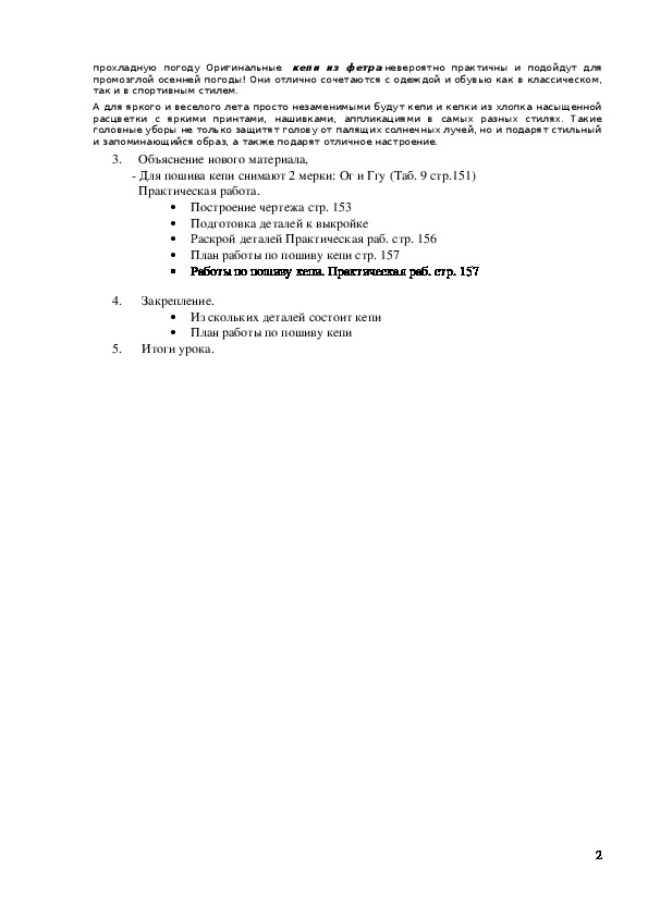 Работы по пошиву кепи. Практическая раб. стр. 157