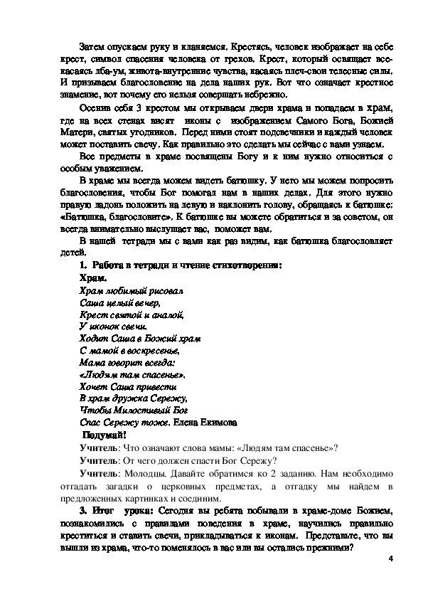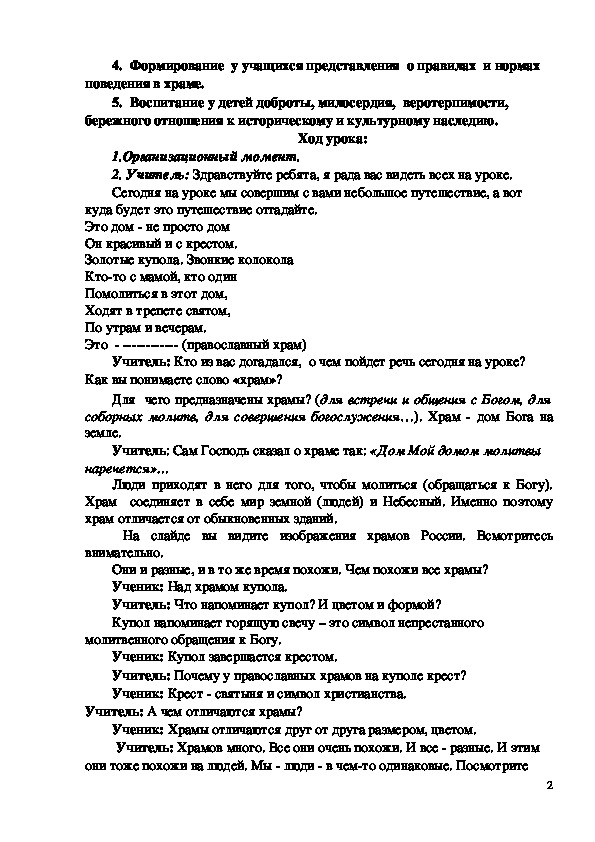 5. Воспитание у детей доброты, милосердия, веротерпимости, бережного отношения к историческому и культурному наследию.Конспект урока "Православный храм" 4 класс