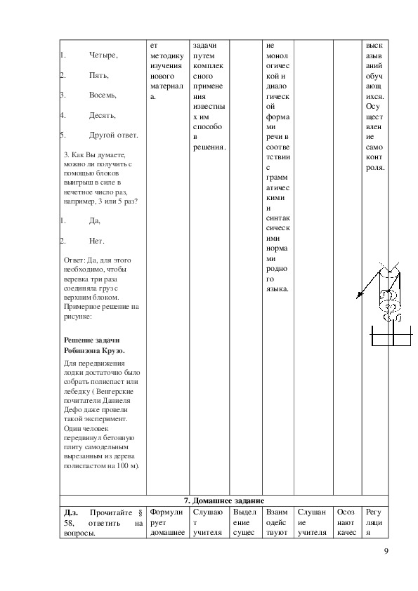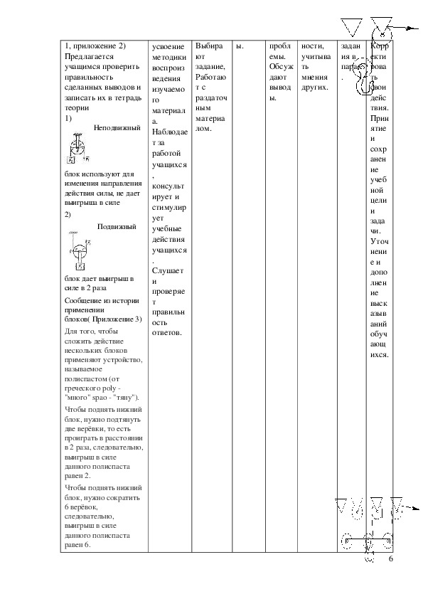 Цель урока: организовать деятельность учащихся по восприятию, осмыслению и первичному закреплению представления о блоке, как разновидности рычага, научить учащихся находить выигрыш в силе, даваемый системой блоков.