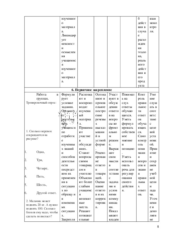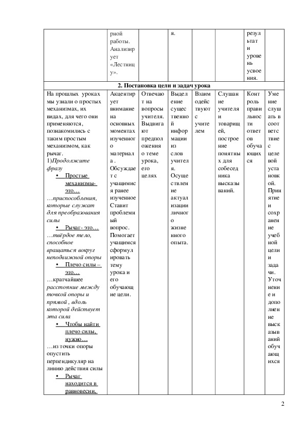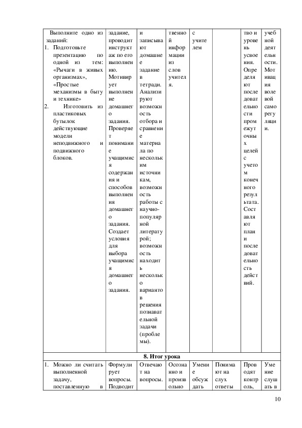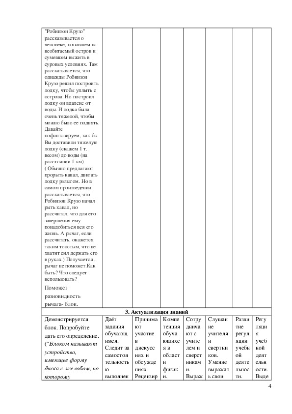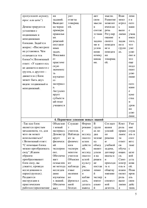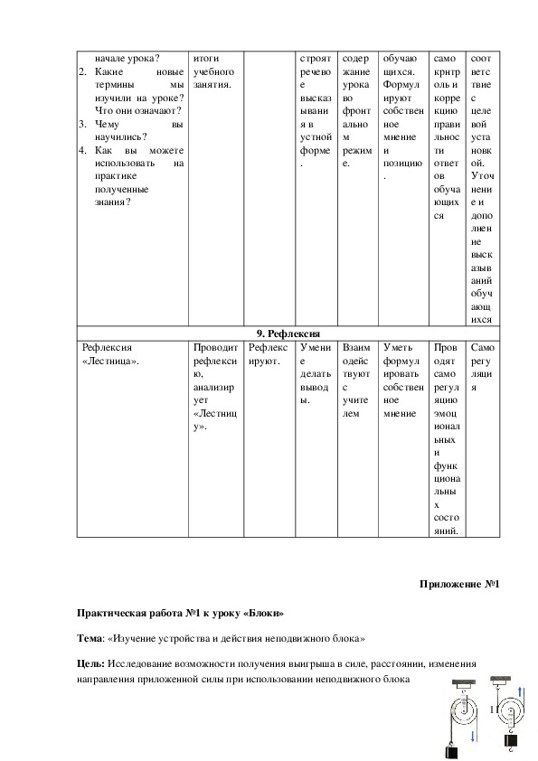 а) формирование представлений о блоке, как разновидности рычага, организация усвоения основных определений и формул по данной теме, формирование научного мировоззрения учащихся (предметный результат);