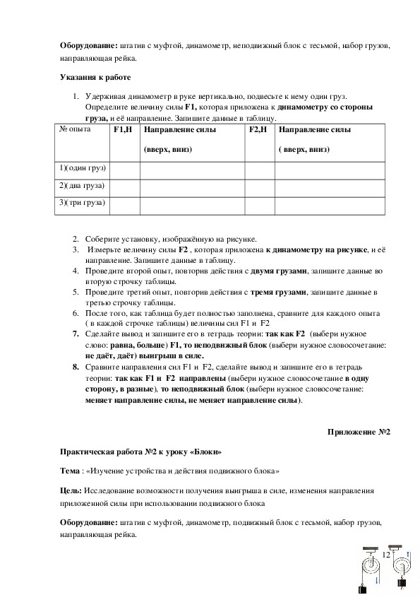 Оборудование: штатив с муфтой, динамометр, подвижный блок с тесьмой, набор грузов,