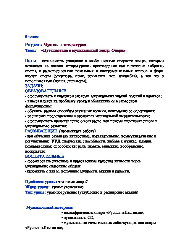 разработка урока музыки для 5 класса, в разделе "Музыка и литература" по программе Г.П.Сергеевой. С целью познакомить учащихся с особенностями оперного жанра, который возникает на основе литературного произведения как источника либретто оперы, с разновидностями вокальных и инструментальных жанров и форм внутри оперы (увертюра, ария, речитатив, хор, ансамбль), а так же с исполнителями (певцы, дирижеры) на примере оперы "Руслан и Людмила" М.И.Глинки. Жанр урока - урок путешествие.конспект урока музыки в 5 классе